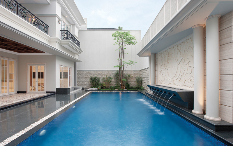 Hunian mengespresikan gaya hidup dan karakter pemiliknya. Inilah yang terwujud pada kediaman yang berlokasi di area Pondok Indah, Jakarta Selatan, hunian Neoklasik ini terlihat luxurious namun tetap elegan. Batu travertine dan granit hitam serta desain railing besi yang mendominasi fasad dan pagar hunian ini.