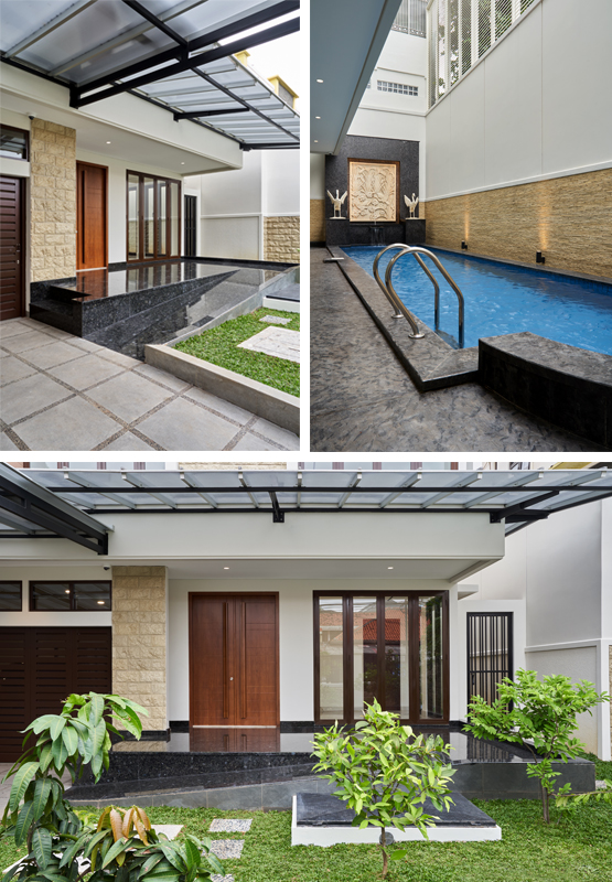 Membangun kolam renang di area rumah dapat menjadi pilihan untuk pemilik rumah yang ingin mencari aktifitas untuk relaksasi. Meskipun terbatas oleh dinding, sirkulasi udara di area ini tetap berjalan dengan baik karena langit-langit yang terbuka. Dekorasi seni dan eksterior yang dihiasi batu alam juga memberikan kenyamanan penggunanya.